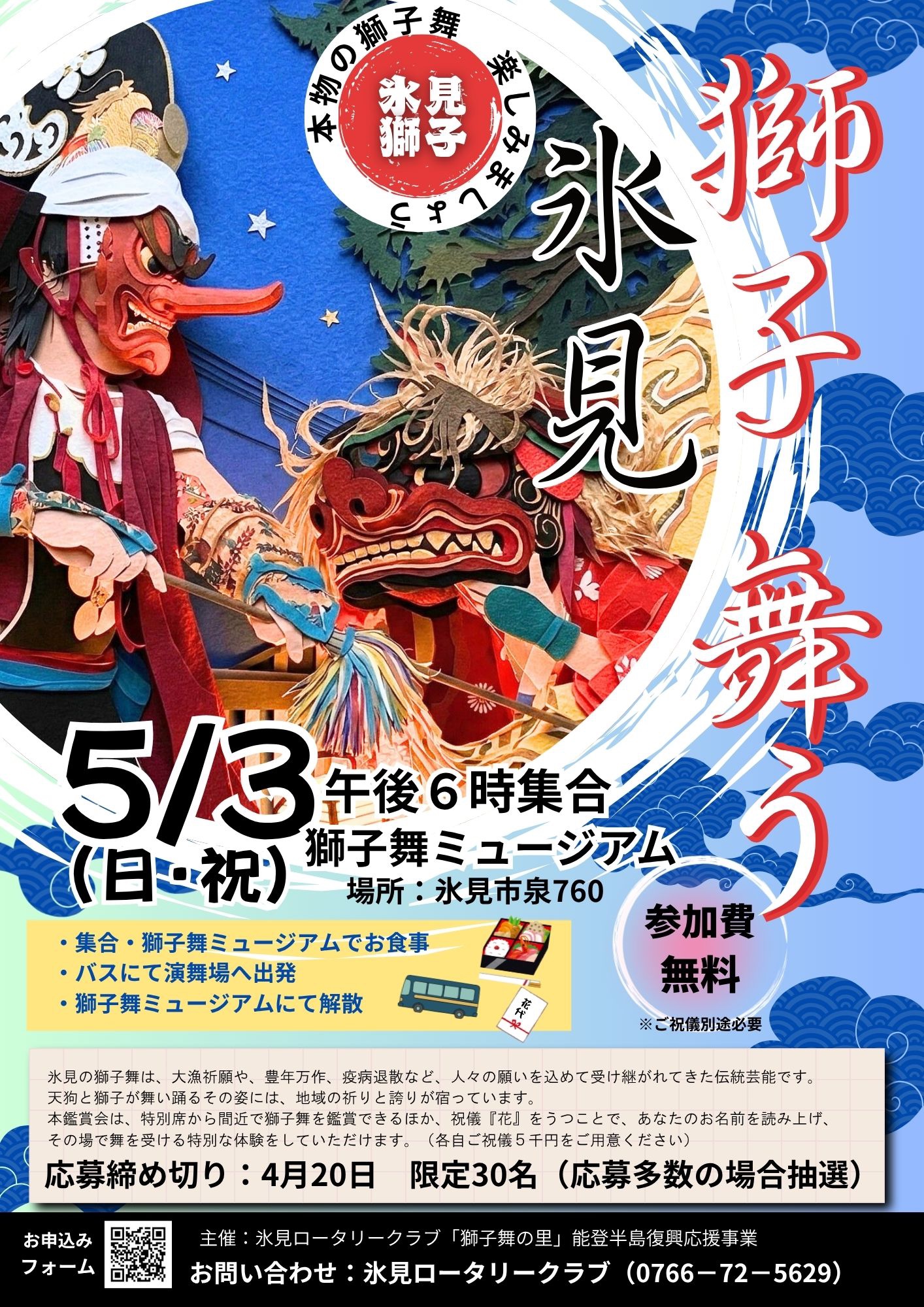 応募方法:QRコードからのお申し込み もしくは氷見ロータリークラブまでお電話ください。(0766−72−5629)