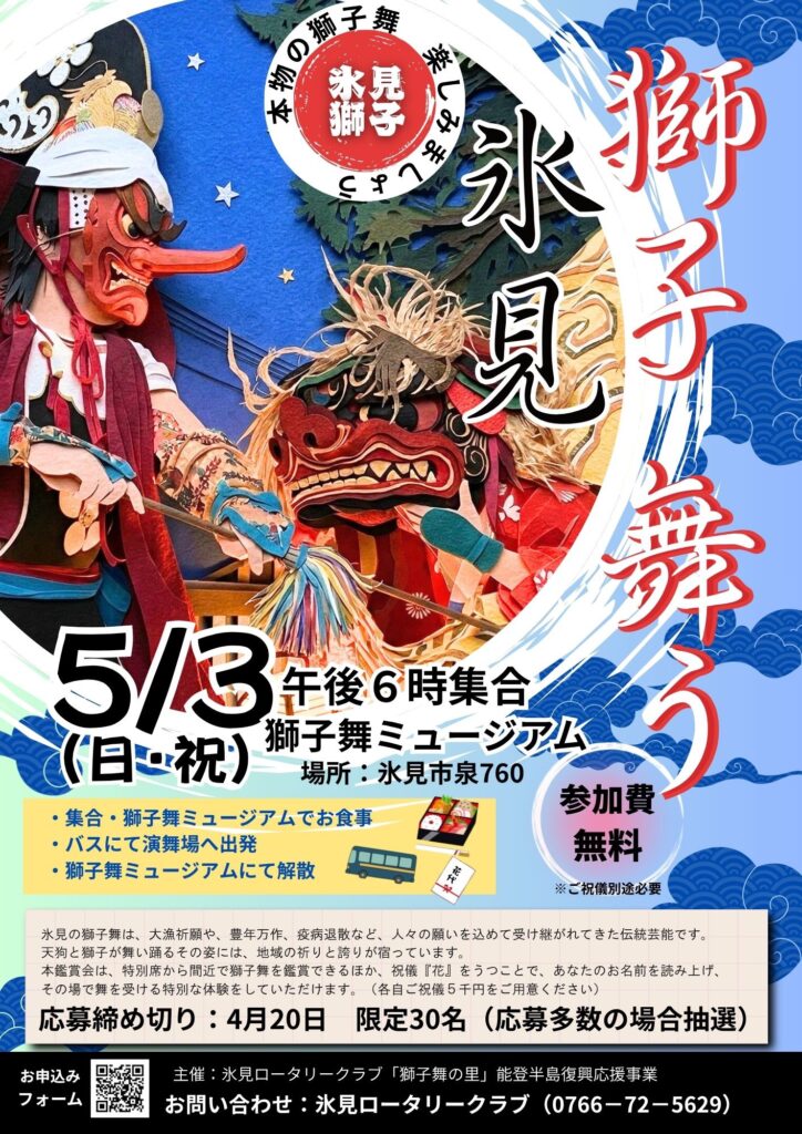 氷見ロータリークラブでは、「獅子舞の里 氷見」能登半島復興応援プロジェクトとして、「みんなで獅子舞たのしまんけ」とイベントを企画いたしました。